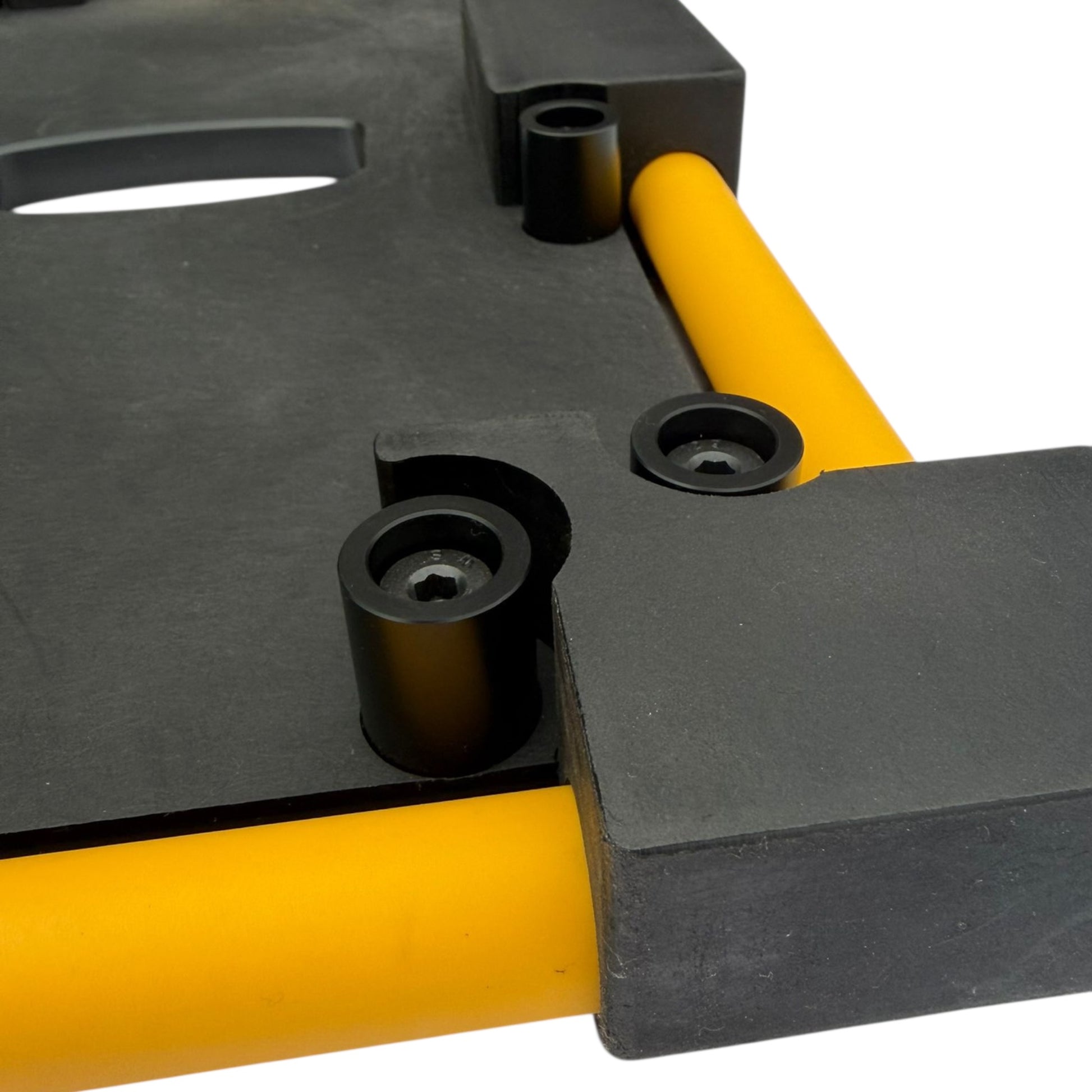 A half-round profile is machined into the UHMWPE base, allowing the rollers to sit recessed into the platform while preventing contact between the roller surface and the plate.